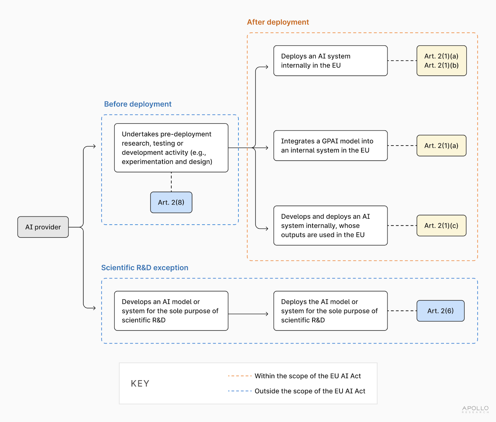 Article 2(8) seems to confirm this interpretation (see §3.3 of the memorandum). Under Article 2(8), the EU AI Act “does not apply to any research, testing or development activity regarding AI systems or AI models prior to their being placed on the market or put into service.” Article 2(8) concerns the time before any type of deployment, either internal or external, and clarifies that the activities that precede the deployment of an AI model or system (for instance, experimentation and planning) do not trigger per se the application of the EU AI Act.
