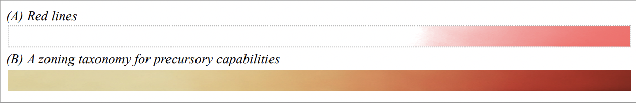 More specifically, we see precursory capabilities as located in what we call a ‘zoning taxonomy’––a gradient where each precursory component may bring us closer to unacceptable risk or ‘red lines’ (Figure A).