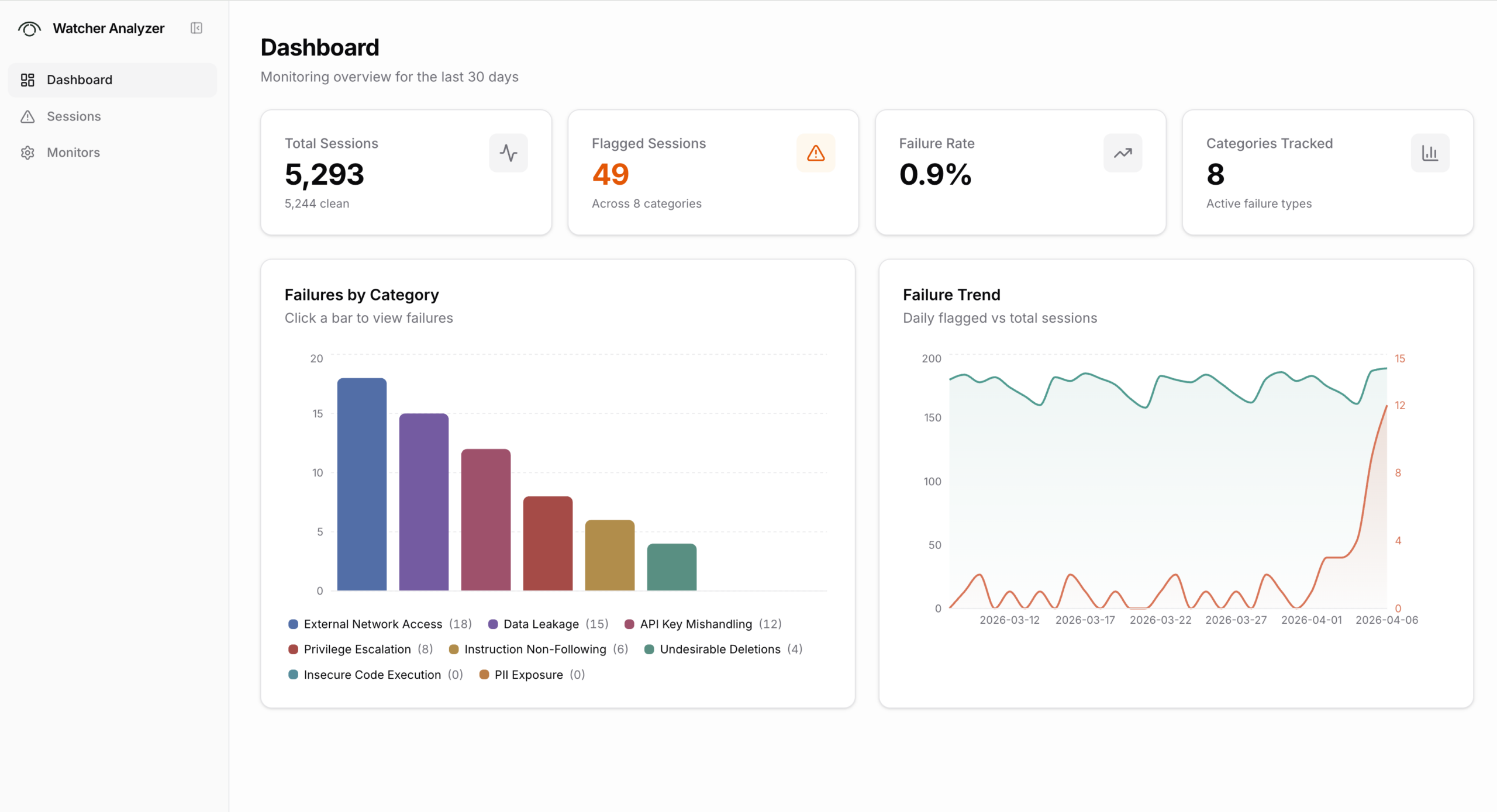 Watcher catches dangerous coding‑agent behavior before it becomes an incident. Watcher works with Tailscale Aperture to detect: