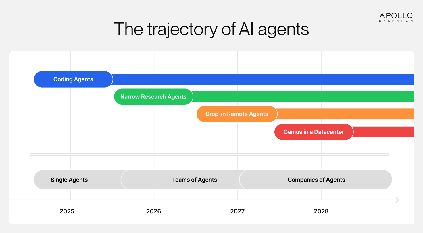 As AI agent capabilities increase, they will become capable of increasingly complex tasks. Currently, we’re already seeing significant improvements in coding agents and early signs of life for narrow research agents, such as Deep Research. Soon, we expect that agents will be general and reliable enough that they can be used as a drop-in remote worker for many white-collar jobs. Eventually, they will likely be able to do entirely novel kinds of research, such as finding new cures to diseases or drastically speeding up AI development itself.