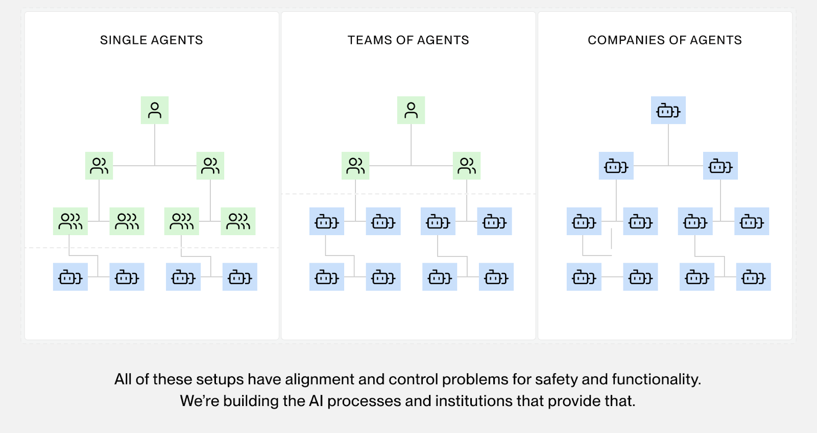There are alignment and control problems at all layers of the agent stack that need to be addressed to create reliable and safe outcomes. Humans have designed and improved institutions for these failures for hundreds of years (e.g., Democracy, Governments, Justice systems, Police, Corporate Governance, …). Given the current pace of AI development, it is possible that similar institutions may need to be designed and built within a decade. Our long-term vision for the product team is to build such institutions at all layers of the future AI agent stack.