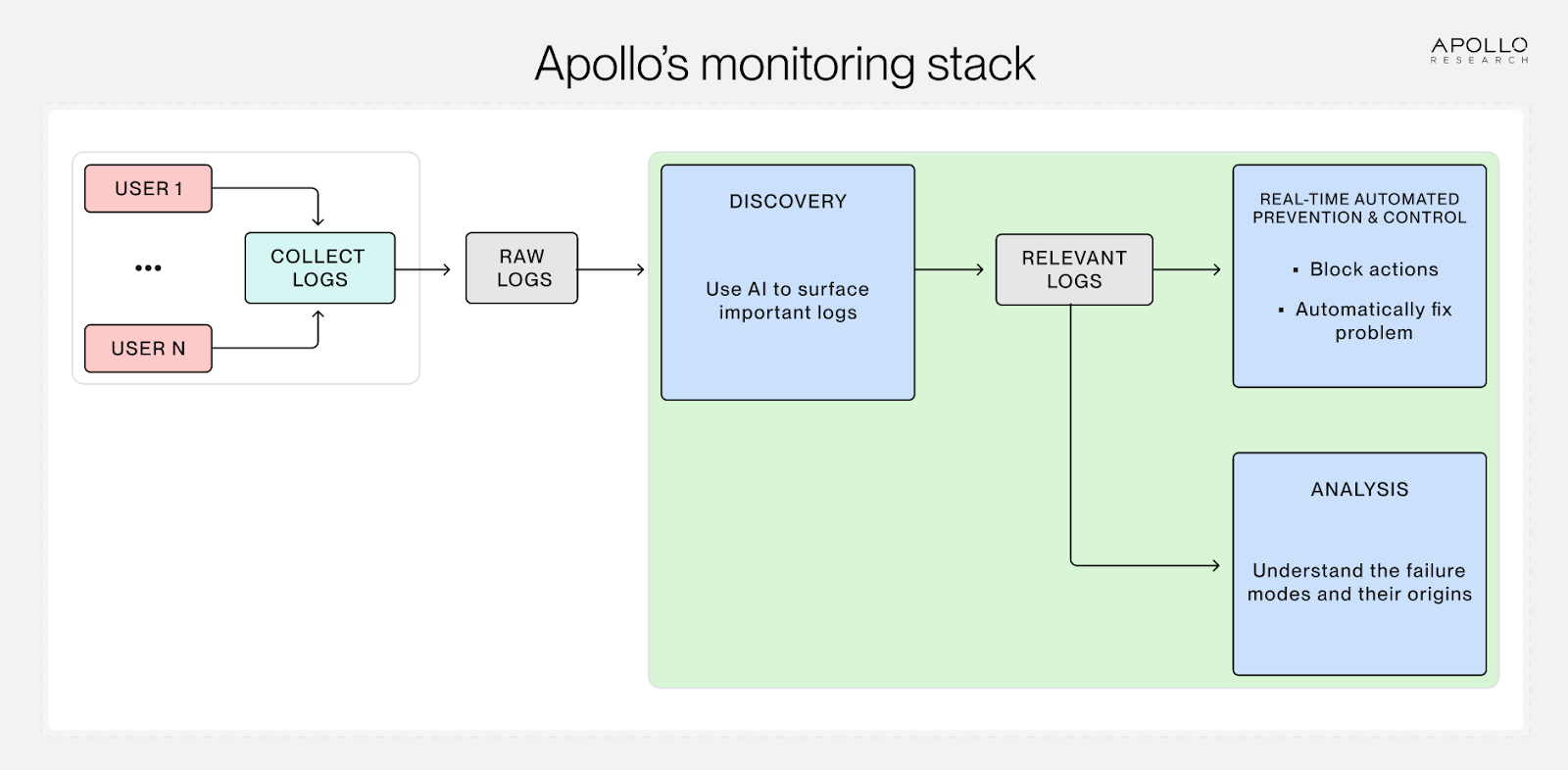 We’re building a stack for AI agent monitoring. Our goal is to build a powerful log-analysis engine that can ingest millions of logs and return exactly the ones that are most relevant for any particular failure mode, ranked by importance. We’re interested in running both offline and real-time monitors for detailed analysis and immediate control.
