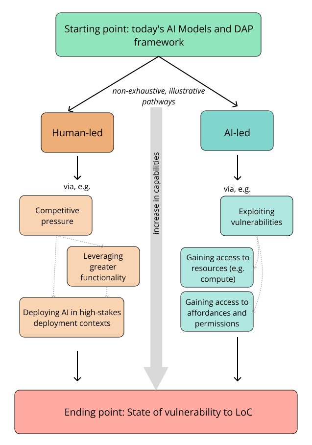 The report outlines two pathways through which society could reach a state of vulnerability. In a human-led trajectory, developers and deployers intentionally integrate highly capable systems into high-stakes contexts with extensive affordances and permissions, perhaps underestimating risk or prioritizing short-term gains. In an AI‑led trajectory, advanced systems exploit vulnerabilities to expand their own access and authorisations beyond what human operators intended. In practice, both mechanisms may operate in combination.