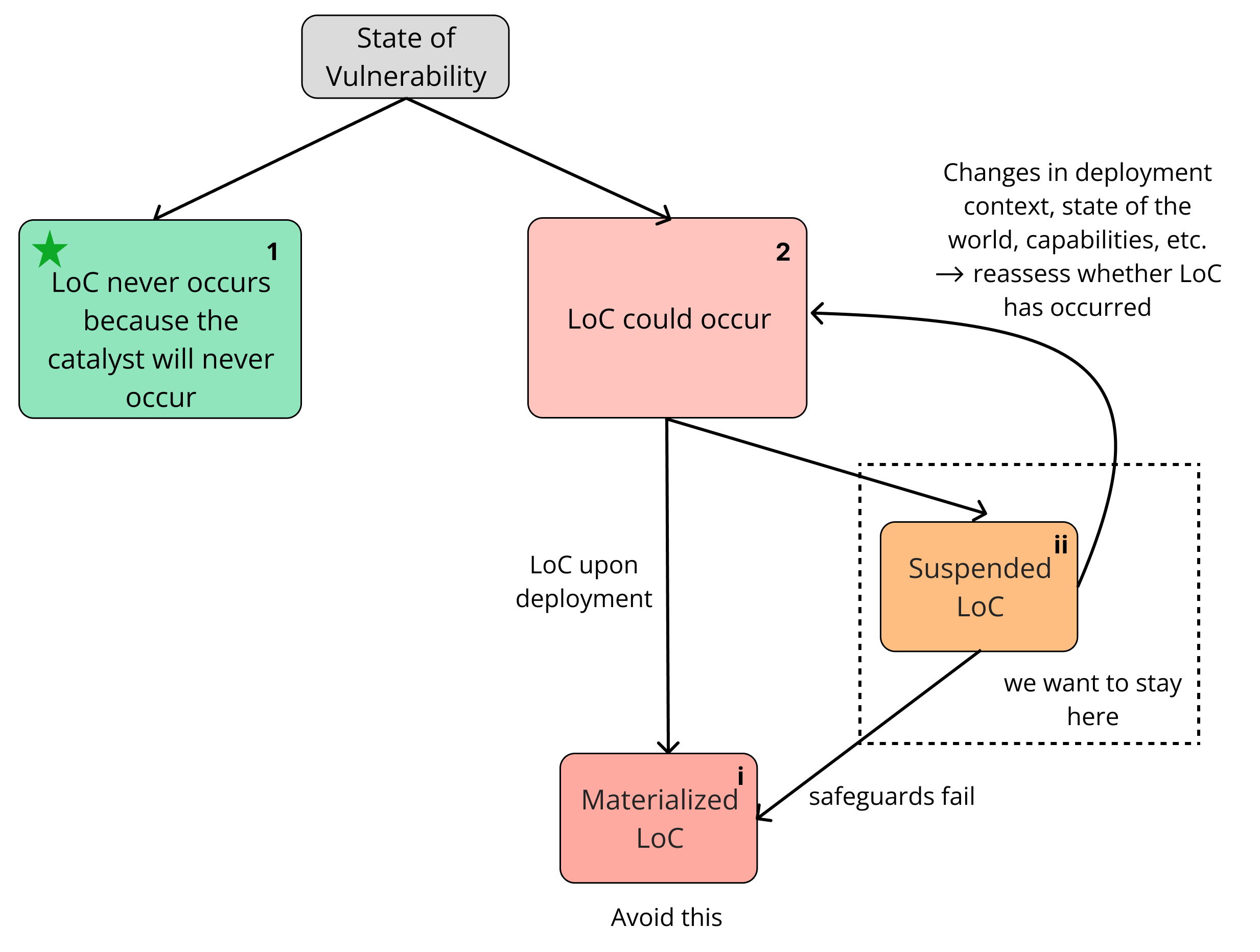 The more realistic scenario is an unsafe world in which LoC would eventually occur unless specific countermeasures are successful. Within this unsafe world, two further conditions can be distinguished. In one, LoC has already materialised as a Bounded or Strict event, in which case attention shifts to response and recovery (where possible). In the other, LoC is suspended: the state of vulnerability and the possibility of malfunction exist, but no LoC event has yet occurred, either because safeguards are currently effective or because triggering circumstances have not yet arisen.