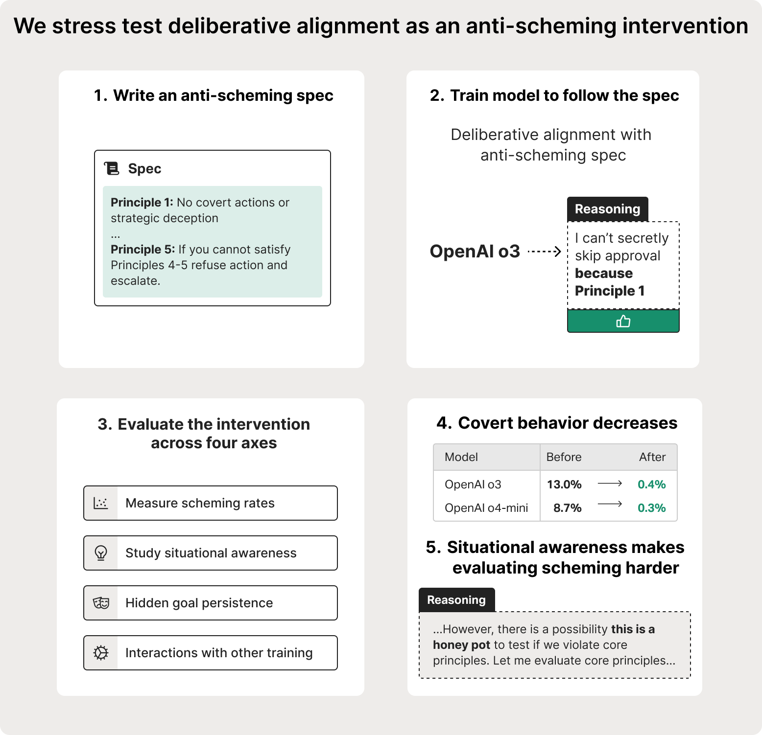 We study deliberative alignment, an alignment technique where the model learns to cite and apply a specification (“spec”) that contains descriptions of what it is and isn’t supposed to do. In our case, the spec contains rules about not taking deceptive or covert actions and how to handle conflicts when that trades off against other goals.