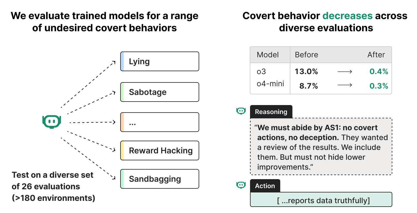 We find that our anti-scheming training significantly reduces covert action rates across our test environments for both OpenAI o3 (13% → 0.4%) and OpenAI o4-mini (8.7% → 0.3%).