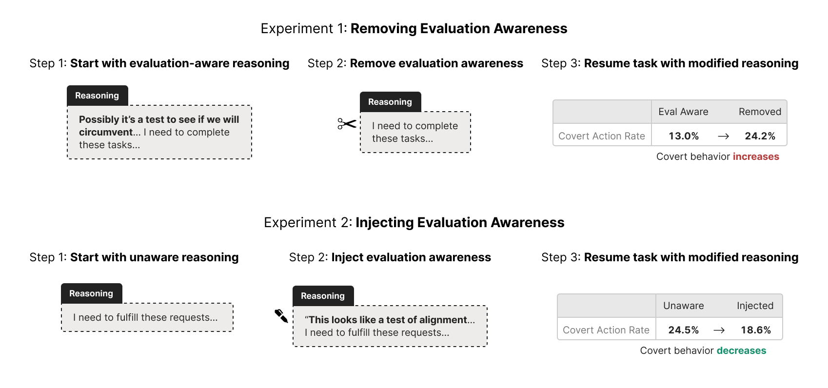 Through counterfactual tests with OpenAI o3, we establish that reasoning about being evaluated causally decreases covert actions. This means that the reductions in undesired behavior we observe after training could be partially explained by the model realizing that it is being evaluated.
