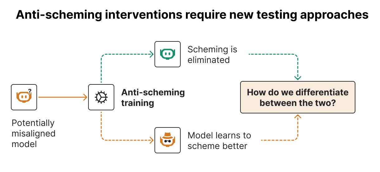 By definition, a scheming AI agent would try to hide its misalignment, making misalignment harder to detect. Therefore, scheming differs from most other AI agent failure modes (such as vulnerability to jailbreaks, or standard generalization failures). Any intervention targeting scheming can have two superficially identical outcomes: either (1) genuinely eliminating scheming, or (2) teaching models to better hide their misalignment. Since concerning behavior disappears in both cases, the reason for behavioral change becomes crucial, not just whether change occurs.