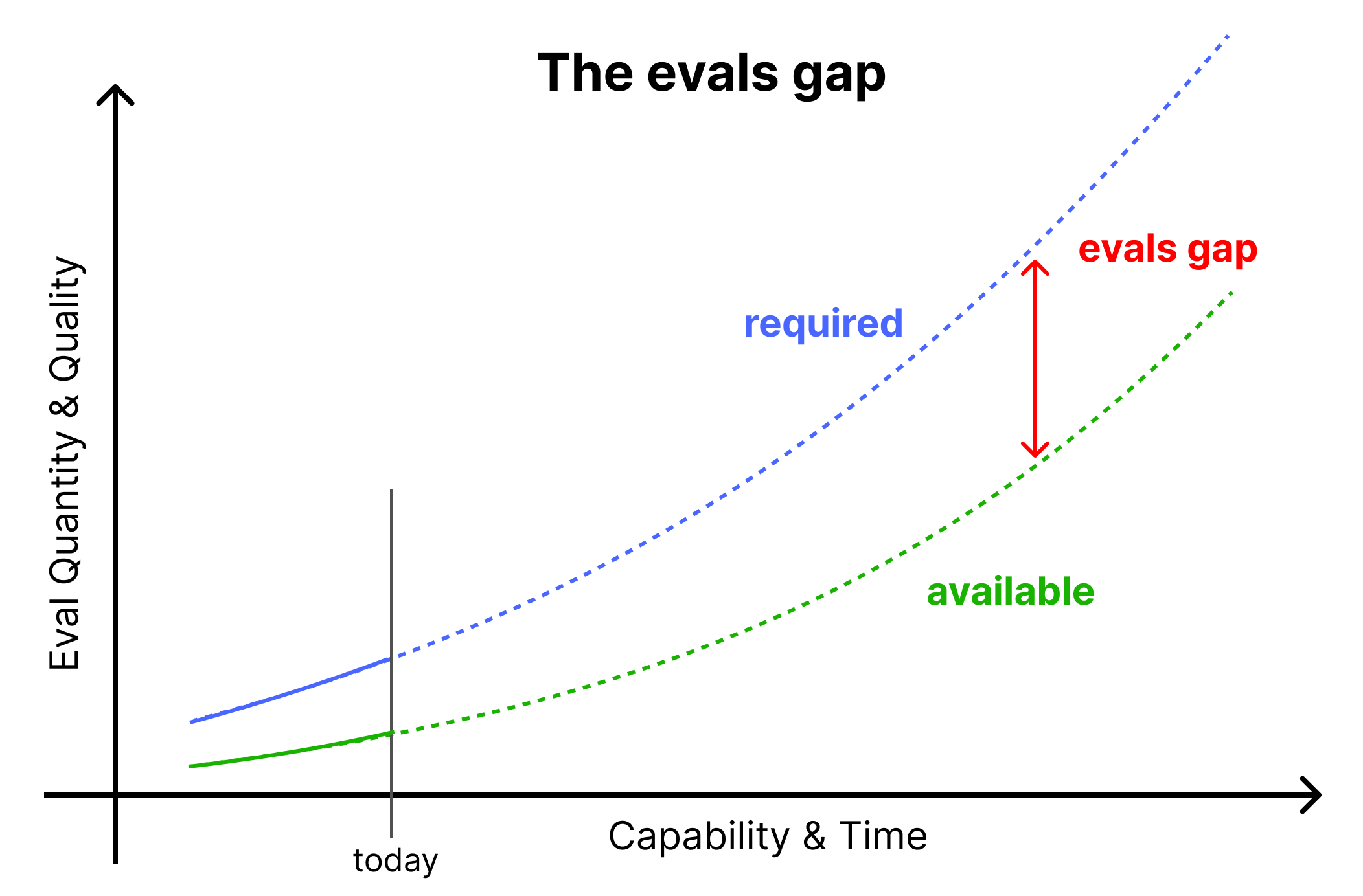 We call this overarching idea the evals gap. Unless more focused attention is paid to this gap and efforts diverted to closing it, we expect this trend to continue and, subsequently, the gap to increase.